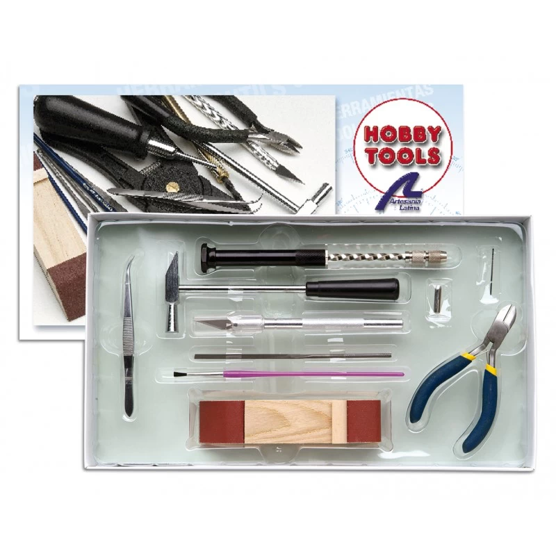Set of basic modeling tools includes cutter, tip nailer, hand drill, cutting pliers, thread tweezers and sander dowel. The main tools that every modeler should have in the initiation phase.
