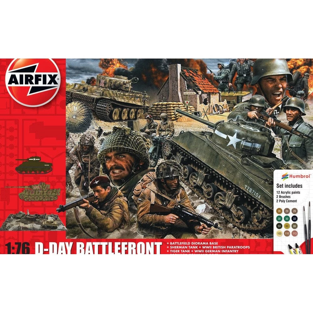 This set includes everything you need to create your very own WWII battle scene. This set comes complete with a Sherman Tank, a Tiger Tank, a Forward Command Post, plus British Paratroops and German Infantry figures. Also including all the paints, brushes and poly cement, you have everything you need to be as creative as you wish.