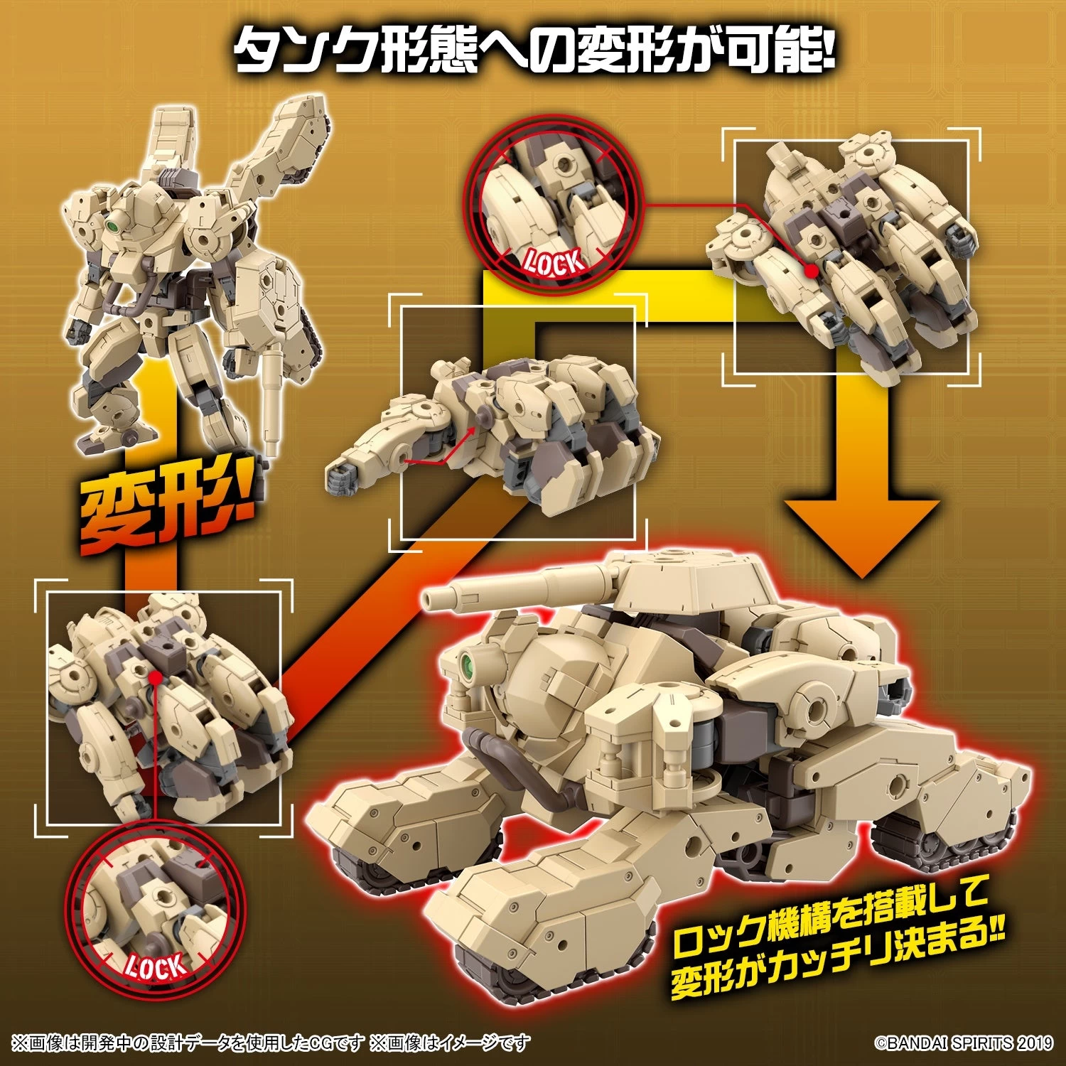 This new aircraft can convert into a “tank” form. The deformation process is equipped with a locking mechanism to stabilize the silhouette after the deformation. Intermediate forms between humanoid and vehicle types can be expressed by customization arrangement. The model kit comes with a bazooka and a shield rifle. Customization with existing 30MM aircrafts and optional parts is also possible.