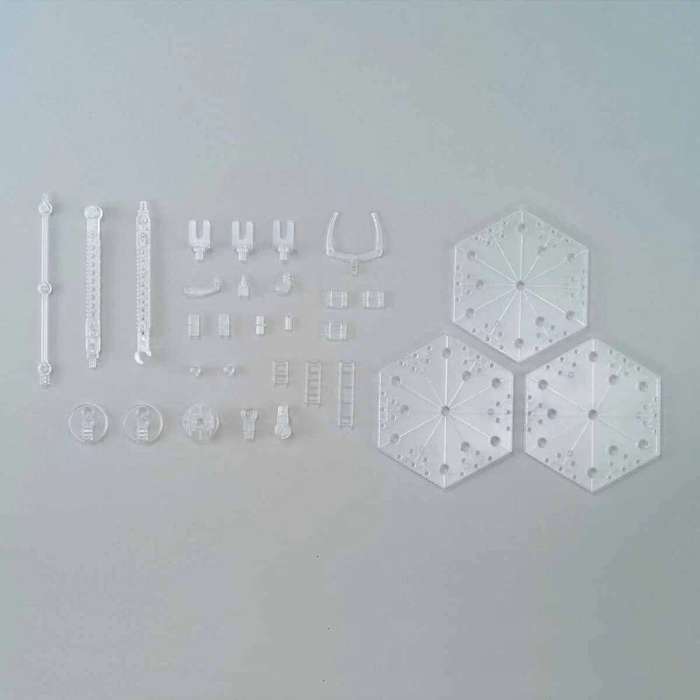This new base from Bandai features three bases, each 2.8cm by 2cm, that can all interlock to form one base, each with lots of openings for support poles. A long support pole 11cm in length is included, as are joint parts and other support parts. Perfect for larger kits like Master Grades and RE/100! This version is clear.