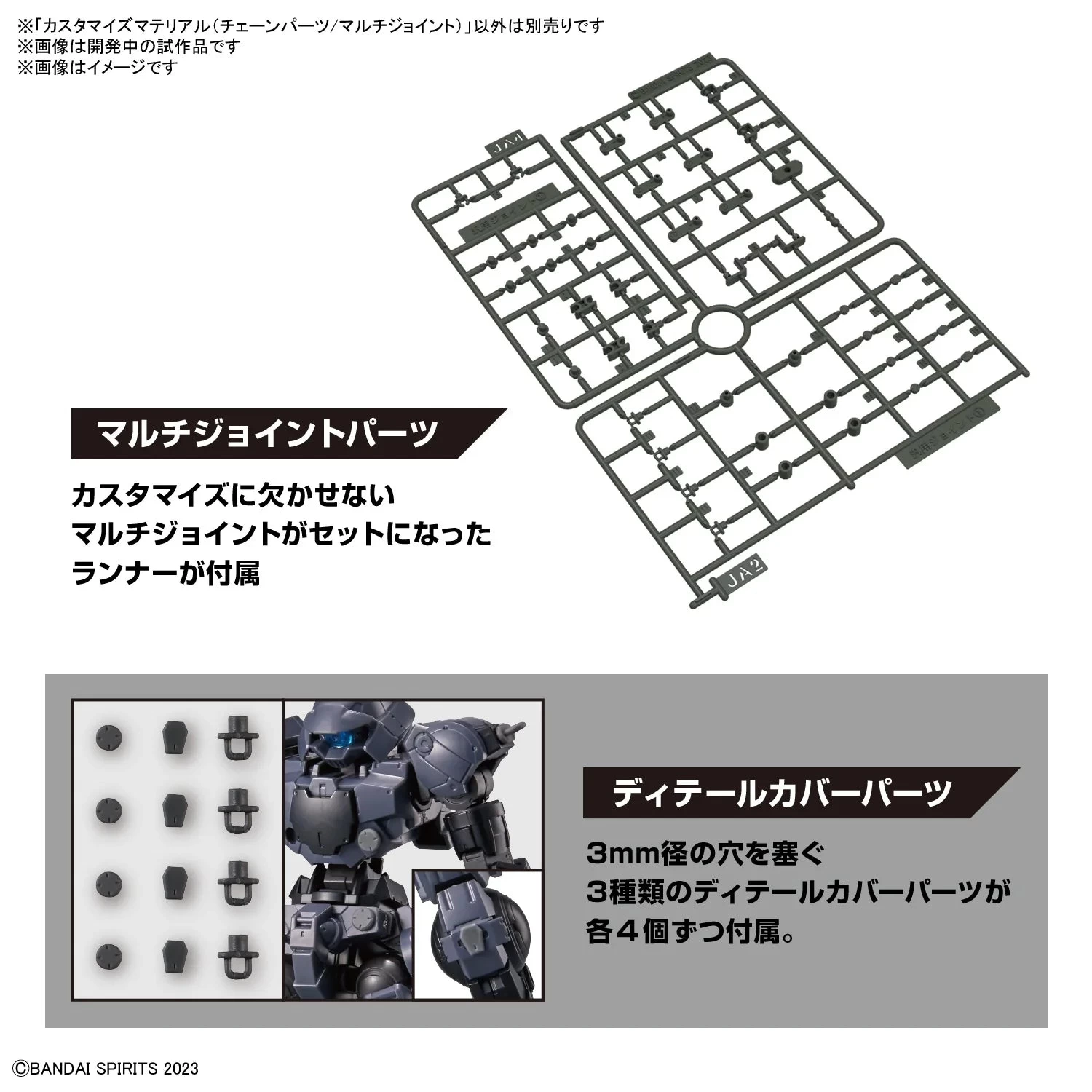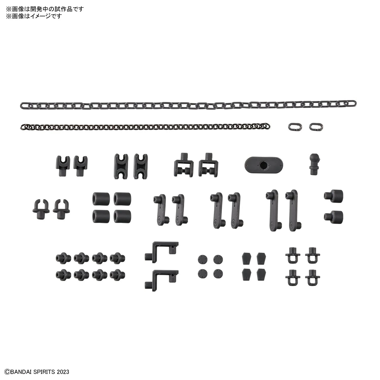 This set includes two types of chain parts: one made of metal and one made of plastic. A runner of multi-joints essential for customization is also included, including 3mm joints, C-type joints, and detail cover parts (includes round, hexagonal and roll-bar types). Use the joint parts to attach the chains to the body and weapons of your favorite models!