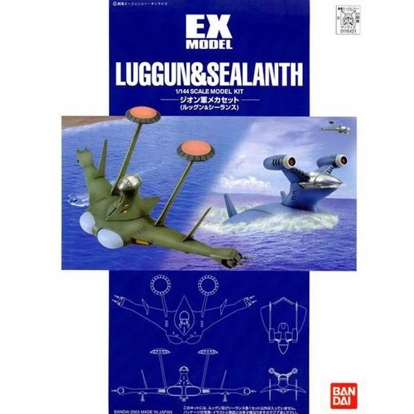 Bandai’s EX series of precision plastic kits are somewhat higher-priced, low-volume kits aimed at older age groups that are hardcore fans. This slick entry in the series features a pair of vehicles, the Luggun and Sealanth, designed for use with Bandai’s various 1/144 HGUC Zakus, Goggs and Z’Goks to extend Zeon’s powers in the air and at sea. Snap-fit assembly; painting is required. An assortment of markings for Zeon forces are included.