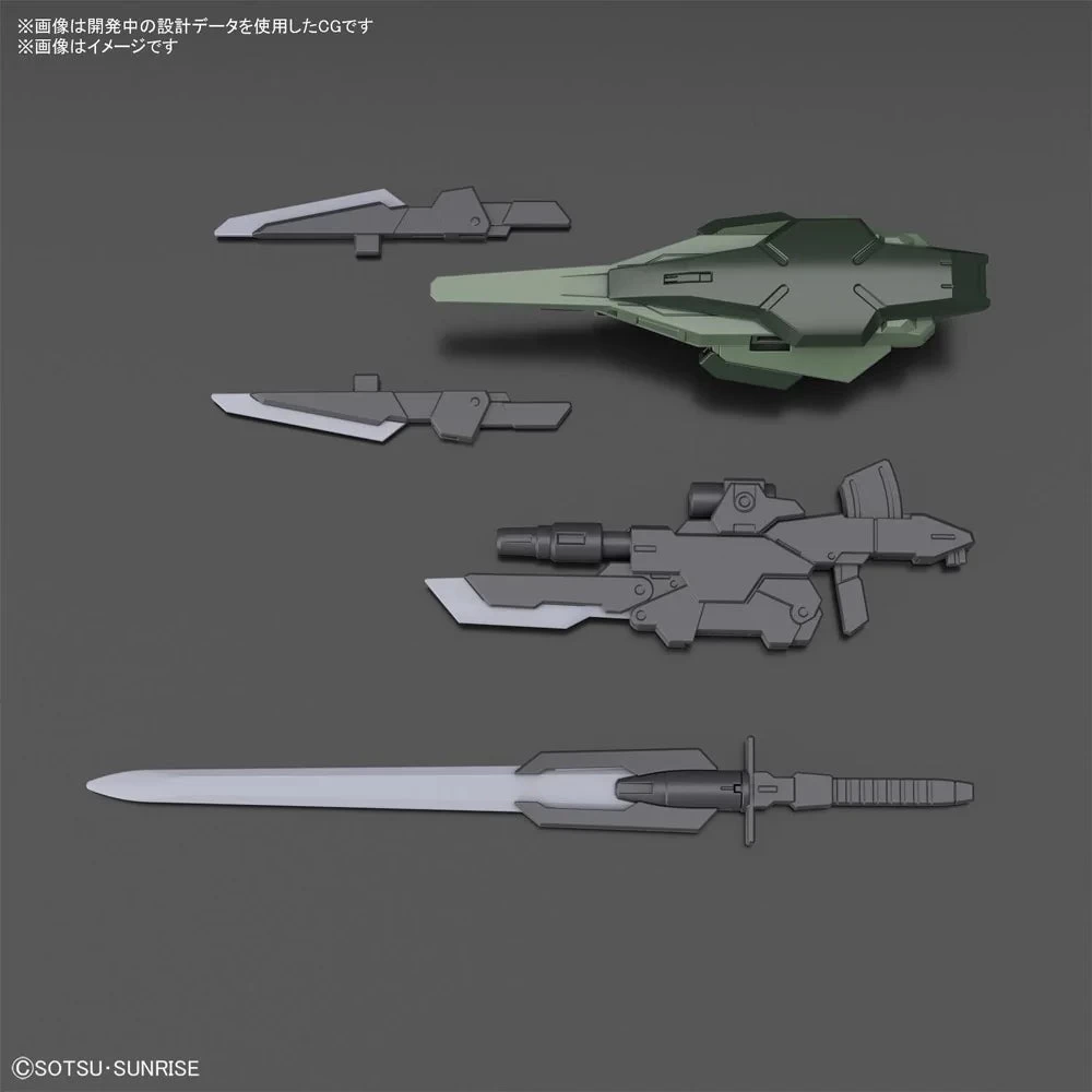 The 00 Qan[T]’s stylish silhouette has been renewed in a deep green colour, and it comes with a large number of weapons such as missile launchers, heavy machine guns, and the Arms Shield. Slashing weapons such as the command sword and double-combat knives stored in the Arms Shield are also included, and its colouring and military elements evoke the Command Gundam.