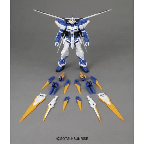 This master-grade model kit features the Gundam Astray Blue Frame D, a unit secretly constructed at Ame-no-Mihashira from the Gundam Seed Astray manga series. The Gundam Astray Blue Frame D is armed with ten Dragoon Swords, a backpack with an Aile Striker, two twin guns, and a long sword. Both standing and sitting pilot figures are also included.