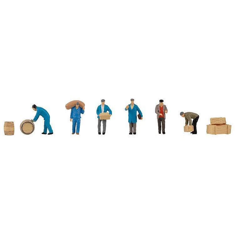 Freight workers with parcels and barrels. Set with figures and accessories.