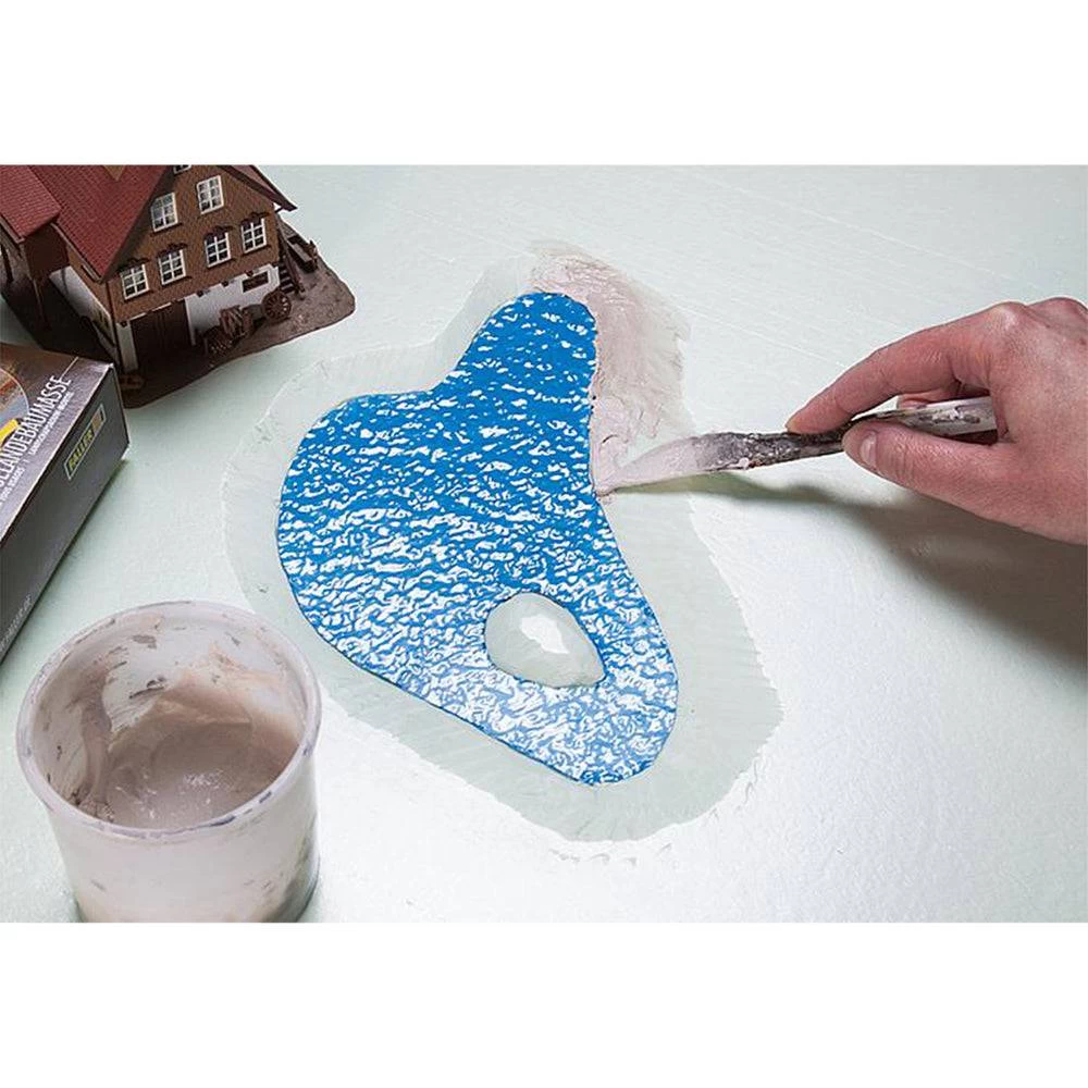 Design the shore area depending on the environment you want to display on your diorama or model layout. The best way to do this is to use the brown pre-colored landscape glue Colofix-Color (Art. 170660). Then sprinkle the desired materials, eg FALLER PREMIUM litter material (item 170728) into the still wet glue. You can also detach sections of our landscape segments (eg Art. 180474) and distribute them on the embankment. The best result is obtained when you finally insert different grass fibers into the still wet glue with the help of the grassing device “Gras-Fix” (article 180691).
