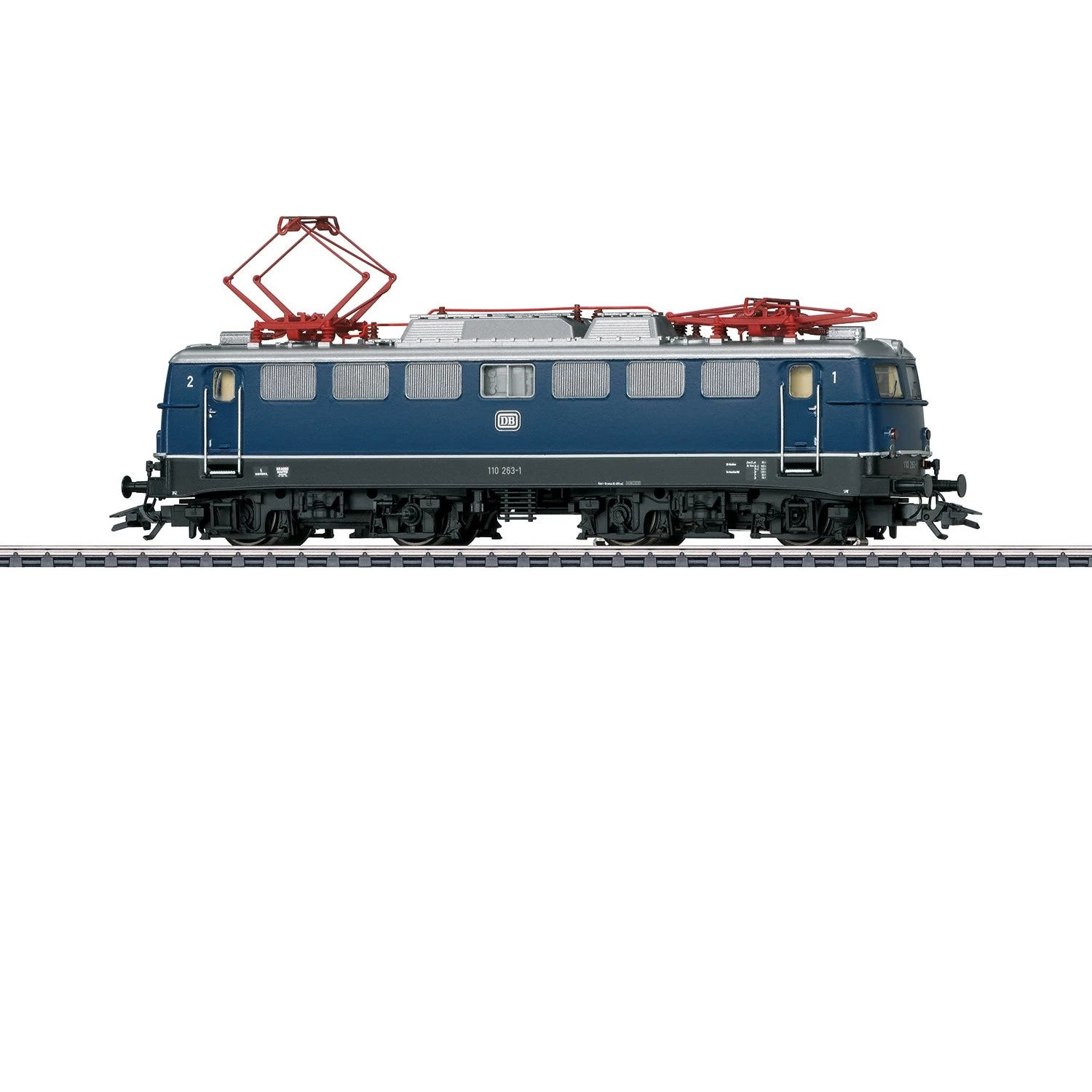 German Federal Railroad (DB) class 110.1 electric locomotive. Includes five lamps (double lamps below). Double forced air vents with vertical fins and rounded engine room windows. Includes a continuous rain gutter. Cobalt blue / black basic paint scheme. Road number 110 263-1. The locomotive looks as it did around 1973.