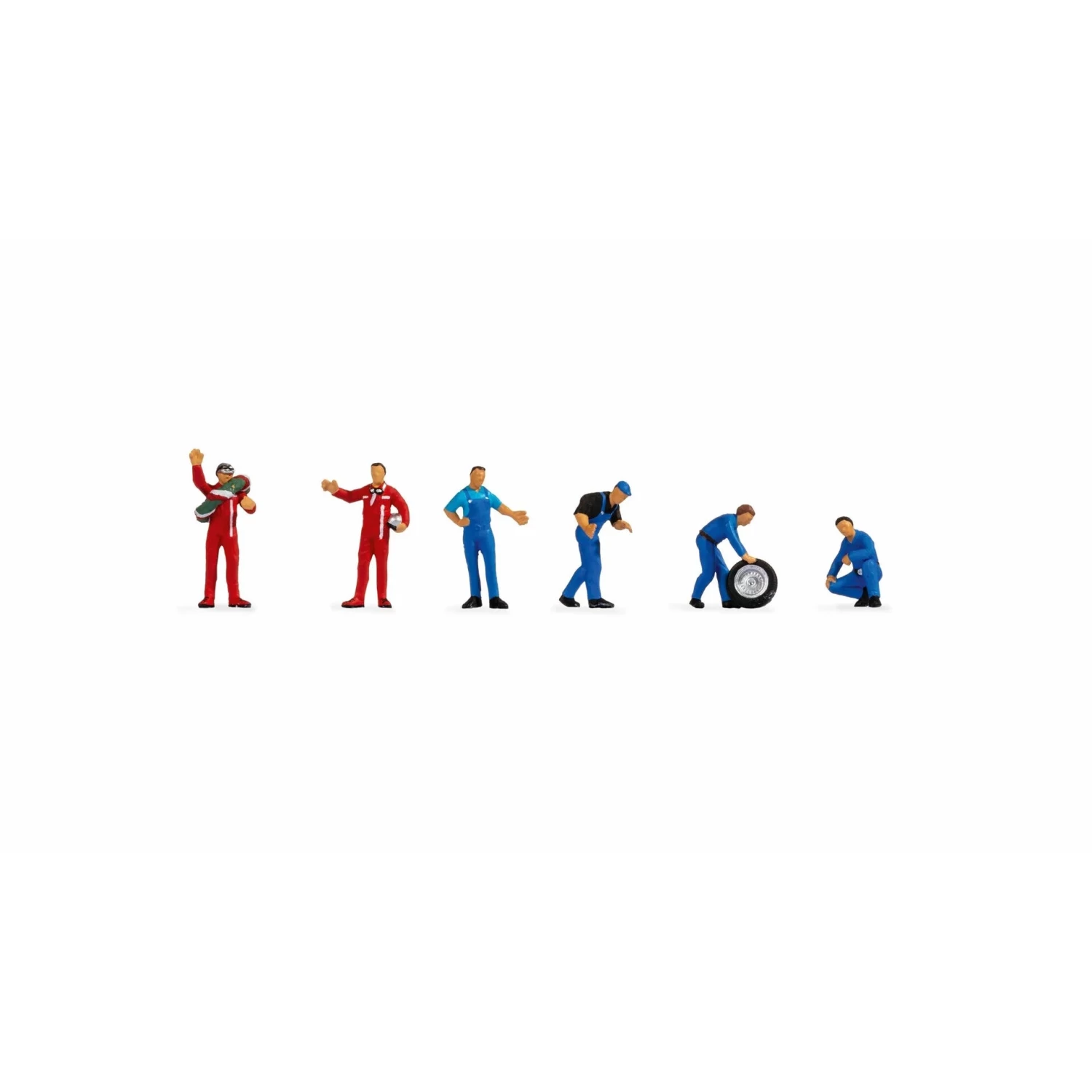 4 figures of mechanics are taking care of the racing cars. They are all wearing blue overalls or dungarees. While one figure is rolling away a loose wheel, another mechanic has set about screwing the racing car’s wheel bolts back on. Another mechanic is leaning over the car to inspect it. The fourth mechanic is standing upright, contemplating his work with his hand on his hips.