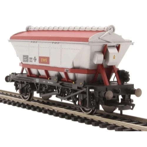 China clay, more formally known as Kaolinite, is one of the main products of the south west of England. Until the 1980s this cargo was transported by rail using small wooden wagons covered with tarpaulin. Based upon the HAA wagon design, CDA wagons featuring a flexible hopper covering to protect the clay from the rain were introduced in 1987 carrying the livery of English China Clays, although more recently they have been repainted in EWS colours.