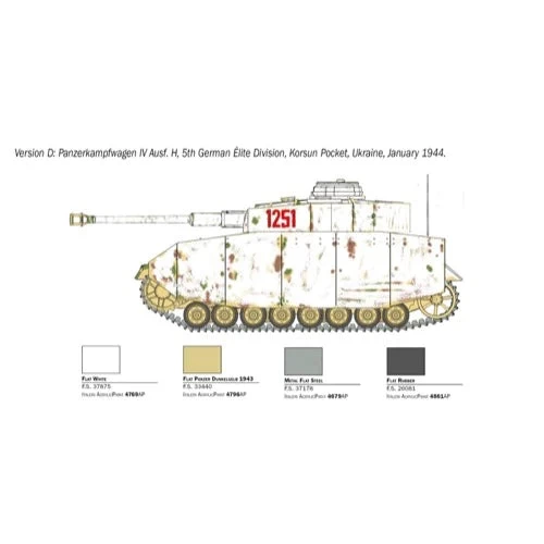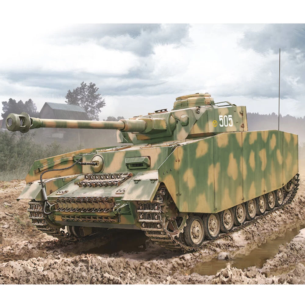 The Panzer IV was deployed for the entire duration of WW2 by the Wehrmacht and benefited from frequent updates. It acquired the status of being known as the “backbone” of the Panzer Divisions on all operational fronts. The Panzer IV Ausf H which came into service from mid-1943, was improved in its offensive capability by the adoption of the 75 mm L / 48 KwK 40 cannon, which was characterized by greater penetrative capability and overall general effectiveness against enemy armoured vehicles. A technical innovation entitled Schürzen, was applied to the tank design which afforded additional sheet metal protection to the sides of the hull and around the turret. This in turn provided greater protection against enemy ‘hits’ and reduced damage to the Panzer. This addition of further side protection was often linked to the use of Zimmerit, a cement-based paste that was applied to the armour