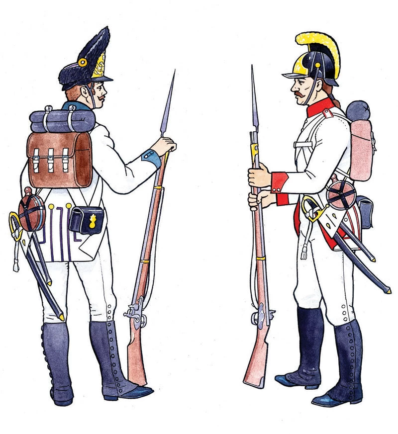 The Austrian infantry of the box is represented with the 1798 helmet characterized the light infantry Frei-Corps and Jagers battalions. Later on they have been adopted by most of Austrian riflemen battalions. In the box, the riflemen are flanked by the grenadiers with the distinctive bearskin caps.