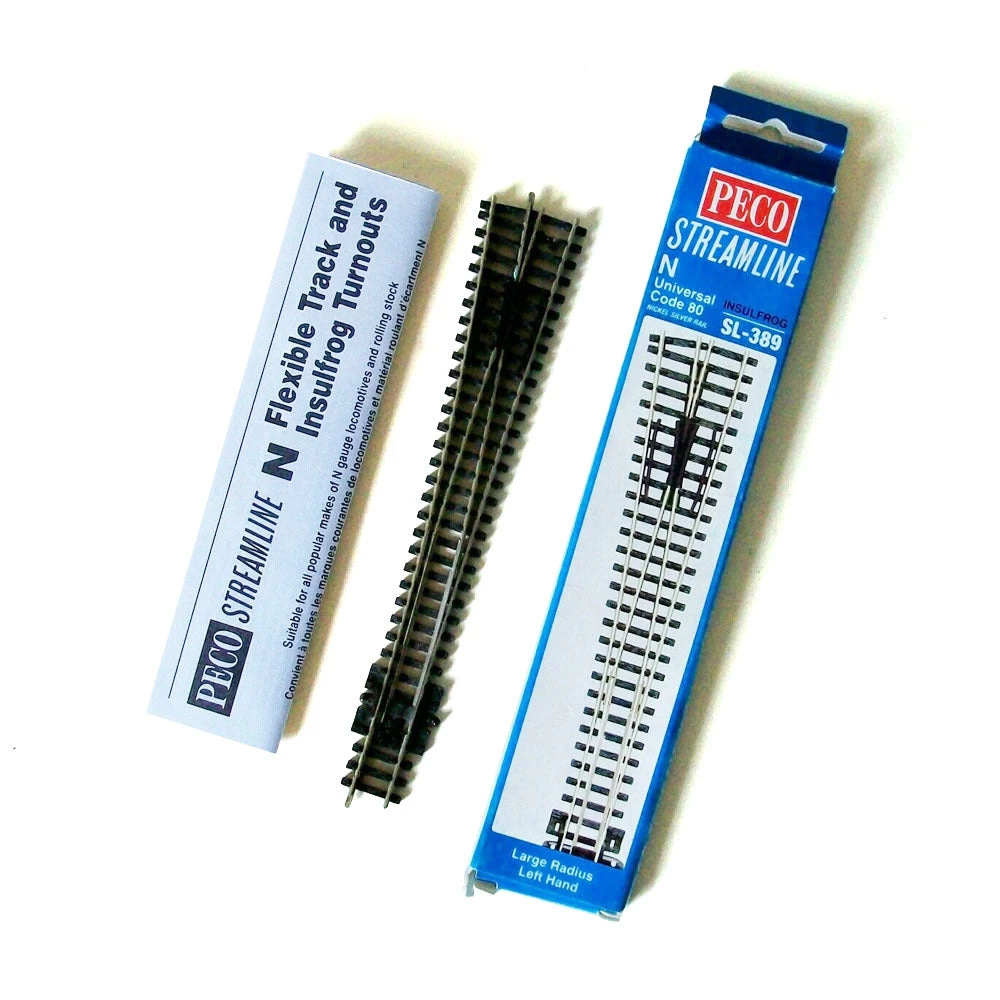 These turnouts can be used with the SL-394 Long Crossing to form a double junction. PECO Streamline N Gauge Code 80 – Universal trackage system. This ever-popular trackage system for N offers a choice of either wooden or concrete type sleeper flexible track and a wide range of turnouts and crossings in both Insulfrog and Electrofrog types. Suitable for all makes of N Gauge trains and fully compatible with PECO Setrack. Two of these turnouts and an SL-394 Long Crossing will form a double junction.