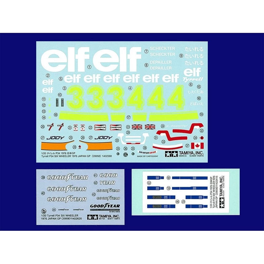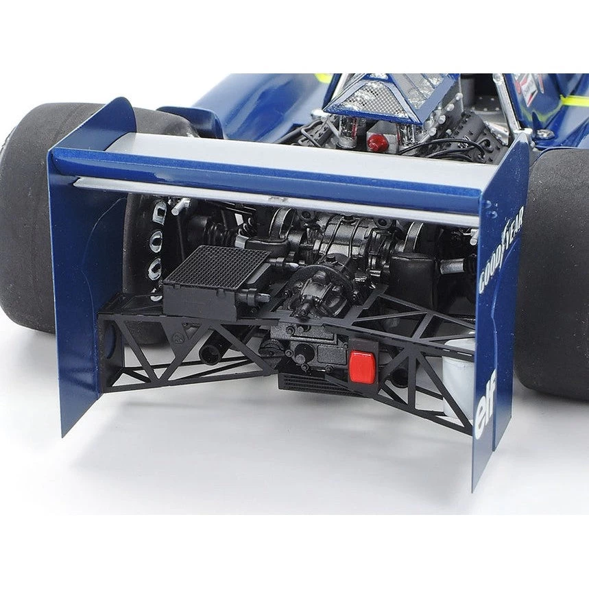 This 1/20 scale plastic model recreates the Tyrrell P34. The Tyrrell P34 caused a sensation within the F1 world when it was unveiled in 1975. It sought to enhance braking and cornering performance by reducing the size of the drag-inducing front tires while preserving contact patch area through the use of 4 tires, thereby creating the only 6-wheeled machine in F1 history. The Tyrrell P34 appeared at the 1976 Japanese GP in an overall blue livery, with the car numbers and body side stripes in yellow and sponsor markings written in white. Team and driver names were also written in Japanese specifically for this race.